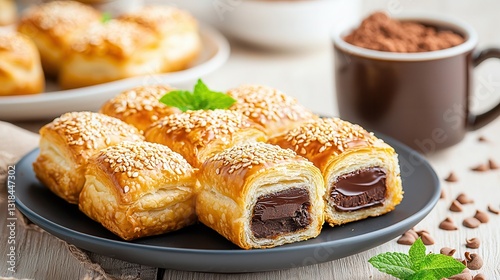 Freshly Baked Puff Pastries with Chocolate Filling on Plate