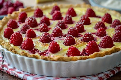 Freshly baked raspberry tart resting in a white ceramic dish, dusted with icing sugar, ready to be enjoyed