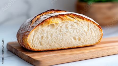 Freshly Baked Rustic Sourdough Loaf with Golden Crust on Wood Board