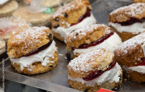 Freshly baked scones filled with jam and cream, dusted with powdered sugar, on display at a market stall in Cardiff, Wales