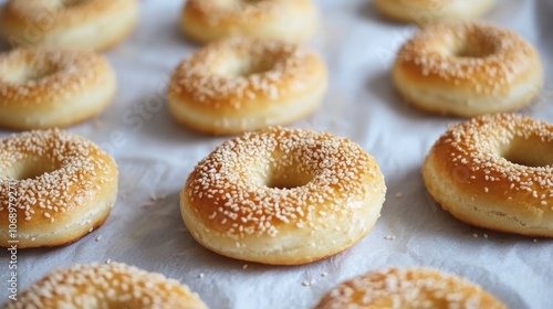 Freshly Baked Sesame Bagels on a Baking Sheet