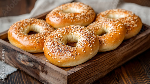 Freshly baked sesame bagels with golden brown crust are arranged in rustic wooden tray, showcasing their soft texture and crisp exterior. sesame seeds add nutty aroma and crunch