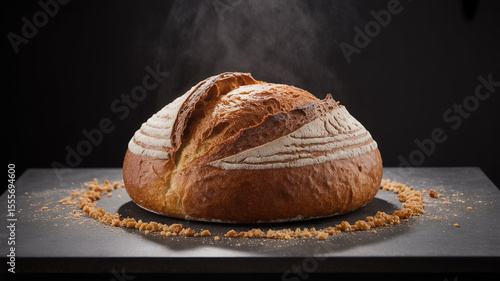 Freshly baked sourdough bread loaf with a golden crust sits on a dark table with crumbs around it