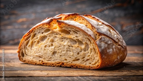 Freshly baked sourdough bread loaf with end piece cut off, made with artisan multigrain flour, sourdough bread