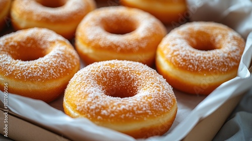 Freshly baked sugared donuts in a box.