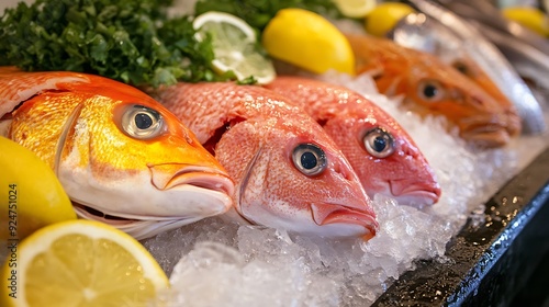 Freshly caught red fish laid on ice with lemons.