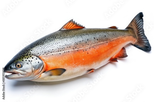 Freshly caught whole salmon with vibrant orange flesh and silver scales lies horizontally on a clean white background, showcasing its succulent texture and freshness.