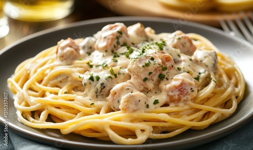 Freshly cooked plate of golden spaghetti pasta with a creamy sauce, soft warm light emphasizing its rich textures and appetizing tones