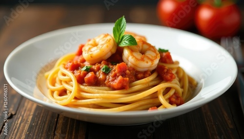 Freshly cooked spaghetti with succulent shrimp in a light and zesty tomato sauce, appetizing, Italian cuisine