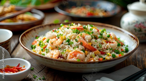 Freshly Cooked Stir-Fried Rice with Shrimp, Presented on a Wooden Table with White China, Exuding Authentic Chinese Cuisine Aroma