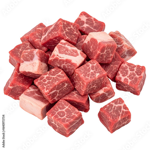Freshly cut raw beef cubes, marbled and ready for delicious culinary creations, perfect for grilling or stewing.