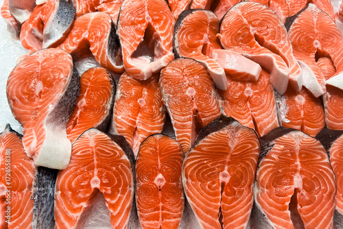 Freshly cut salmon fillets displayed on a market counter for sale and preparation