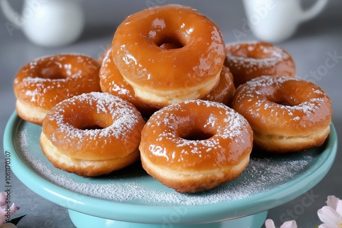 Freshly glazed donuts arranged beautifully on a teal plate with powdered sugar