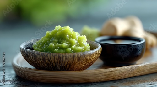 Freshly Grated Wasabi Served with Soy Sauce and Pickled Ginger on Wooden Platter