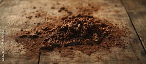 Freshly ground coffee showcases a rich brown texture on a weathered wooden surface, with fine granules scattered against the rustic backdrop.