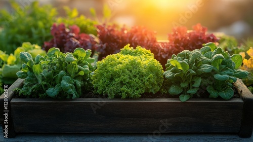 Freshly Grown Leafy Greens in Wooden Planter Under Beautiful Sunset with Stunning Natural Colors for Organic Gardening and Healthy Lifestyle Promotion