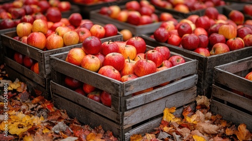 Freshly harvested apples in rustic wooden crates, surrounded by colorful autumn leaves