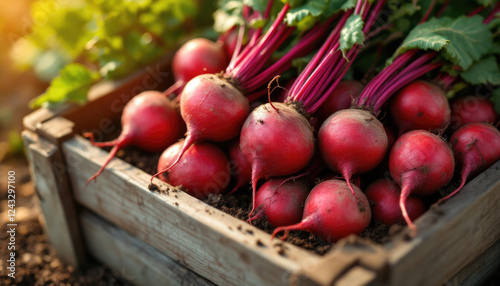 Freshly harvested beetroots in wooden crate amidst sunlit garden foliage