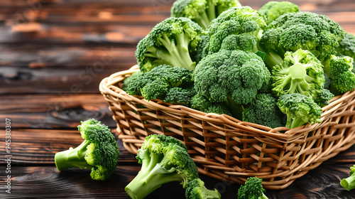 Freshly harvested broccoli filling a rustic basket displayed on a weathered wooden surface