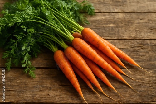 Freshly harvested carrots with vibrant green leaves rest on a rustic wooden surface, symbolizing nature's bounty and the simple pleasures of fresh produce