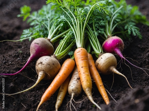 Freshly Harvested Colorful Root Vegetables Displayed on Dark Soil Background for Healthy Eating and Organic Lifestyle Promotion.