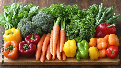 Freshly harvested colorful vegetables arranged on a wooden board, showcasing vibrant greens and oranges