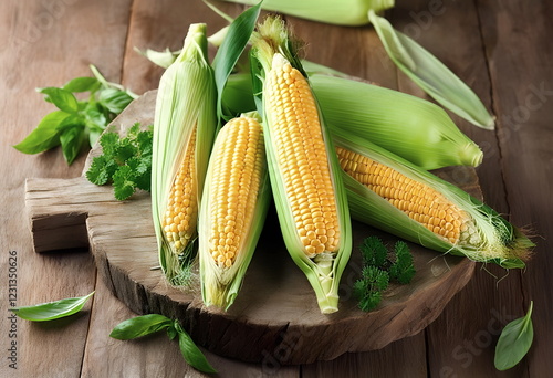 Freshly harvested corn cobs arranged on a rustic wooden board with green herbs