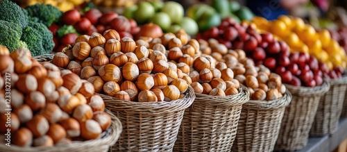 Freshly harvested fruits and vegetables displayed in woven baskets at a farmers market with Copy Space for text inclusion