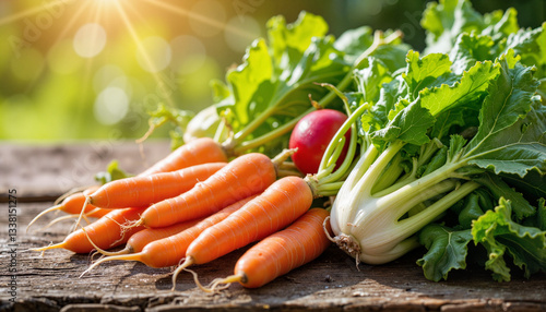 Freshly harvested garden vegetables on rustic wooden table, vibrant health