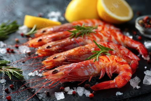 Freshly harvested Langostino Australis shrimp garnished with lemon and herbs on a slate board with ice