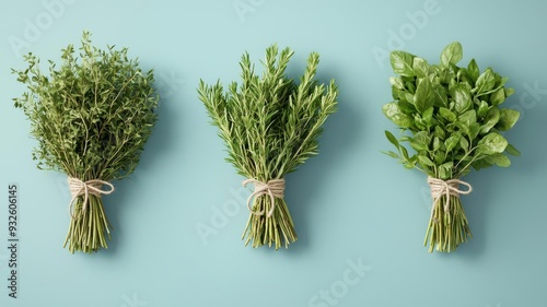 Freshly harvested organic herbs, bunches tied with twine, 3D illustration