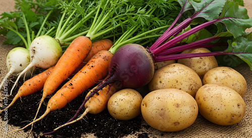Freshly Harvested Organic Root Vegetables Displayed on a Burlap Sack Surface