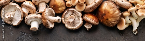 freshly harvested organic shiitake mushrooms, oyster mushrooms, and enoki mushrooms on rustic wooden background - perfect for gourmet cooking and culinary applications
