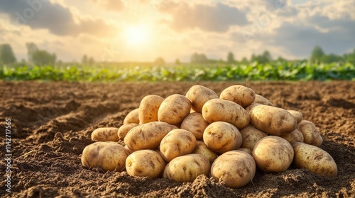 Freshly Harvested Potatoes Glistening in Sunlight, a Bountiful Crop in a Field at Sunset