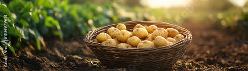 Freshly harvested potatoes in a basket on the ground, bathed in sunlight, with vast fields of potatoes in the distance