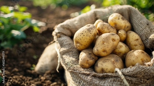 Freshly harvested potatoes in a sack on farm soil during sunny day, symbolizing farming, agriculture, and the natural bounty of the earth.