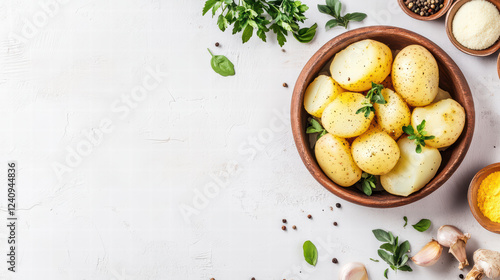 Freshly harvested potatoes in wooden bowl, garnished with herbs and spices, create vibrant and appetizing display. Perfect for culinary inspiration