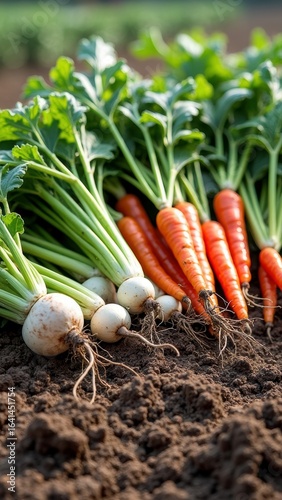 Freshly harvested radishes and carrots in a sunny vegetable garden
