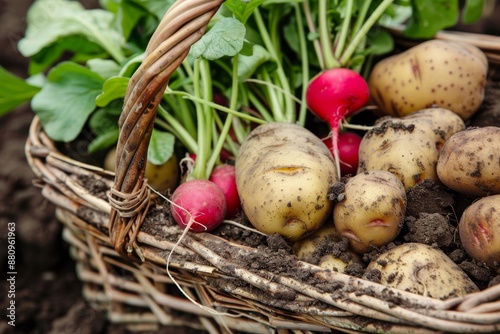 Freshly Harvested Root Vegetables in a Basket - Potatoes and Radishes with Soil