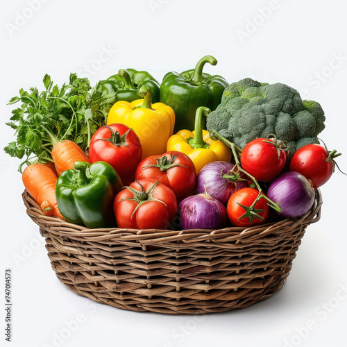 Freshly harvested vegetables in a white basket - tomatoes, peppers, cucumbers, and onions - showcasing a healthy, organic bounty from the garden
