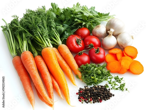 Freshly Harvested Vegetables Including Carrots, Tomatoes, Garlic, and Herbs Set Against a White Background for Culinary Use or Health-Focused Content
