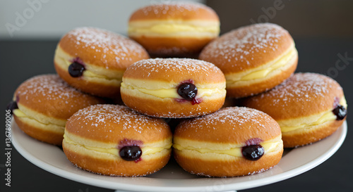 Freshly made jam-filled donuts dusted with powdered sugar, arranged on a white plate. Delicious dessert concept, perfect for sweet treats, bakery photography, and indulgent snacks.