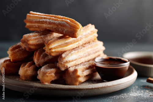 Freshly made Spanish churros dusted with cinnamon sugar, served with rich chocolate dipping sauce on a ceramic plate.