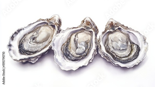Freshly Opened Oysters Displayed on a White Background, Showcasing Their Natural Texture and Color, Perfect for Culinary, Seafood, and Gourmet Food Concepts