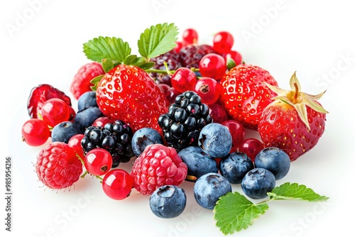 Freshly picked berries and raspberries arranged on a white surface