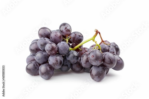 Freshly picked bunch of ripe black grapes with water drops on white background