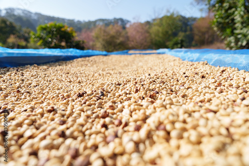 Freshly picked coffee beans from the farm are being dried in the sun before being roasted.