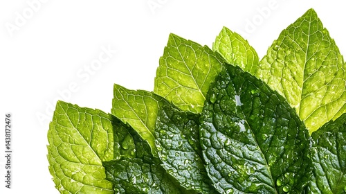 Freshly picked mint leaves with water droplets arranged on a white backdrop