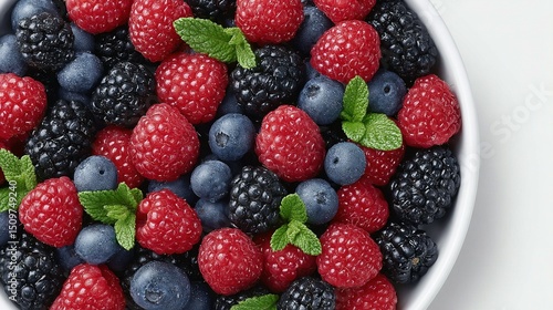 Freshly picked mixed berries in a white bowl.
