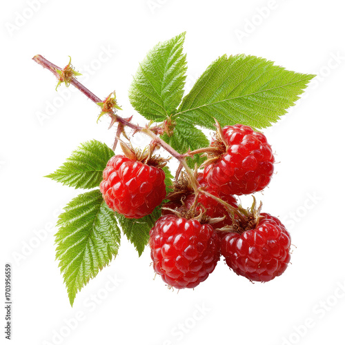 Freshly picked raspberries with green leaves on a white background highlighting their vibrant color and texture